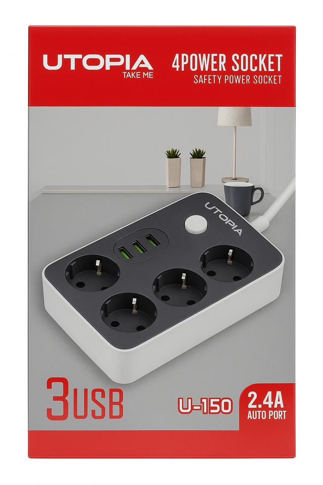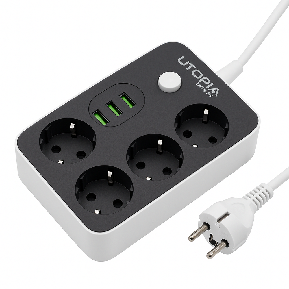مشترك كهرباء Utopia U-150 هو الحل العملي والقوي لكل احتياجاتك من الطاقة، يجمع بين 4 مخارج كهربائية و3 منافذ USB شحن سريع 2.4A في جهاز واحد مدمج. يتحمل حمل يصل إلى 2500 واط، مزود بسلك 2 متر وحماية شاملة من الصواعق والحمل الزائد، مثالي للمنزل والمكتب والسفر.
