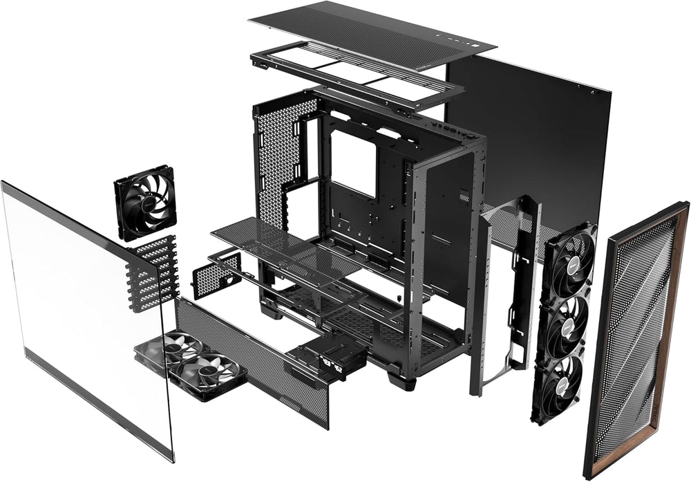 Crafted from durable steel and accented with genuine walnut wood, this chassis boasts a sturdy 13.6kg build that resists vibrations and ensures longevity in demanding environments. Its modular design, including a detachable PSU chamber and adjustable front bracket, adapts to your workflow, blending industrial strength with sophisticated aesthetics for a case that stands out on any desk.