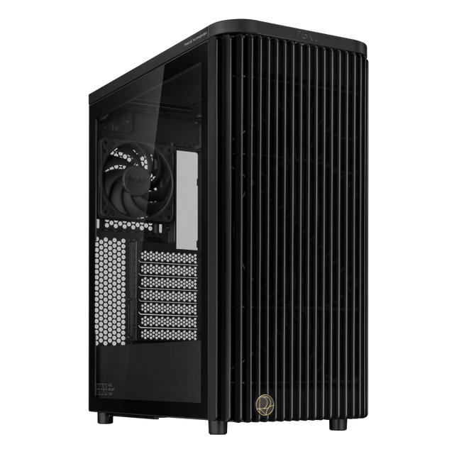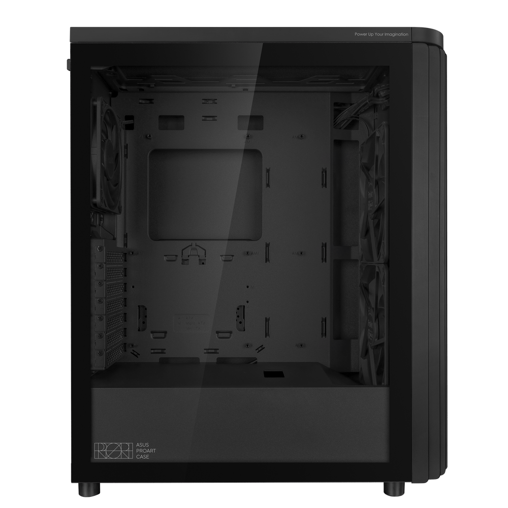 Elevate your professional setup with the ASUS ProArt PA401, a sophisticated mid-tower PC case in premium black, blending natural FSC-certified ash wood accents with modern engineering for creators and pros. It includes two pre-installed 160mm Ring Blade fans for exceptional front intake, a full tempered glass side panel for showcasing internals, and a high-airflow mesh chassis that ensures efficient cooling for demanding workflows like video editing or 3D rendering.